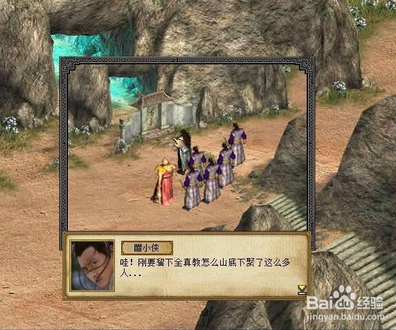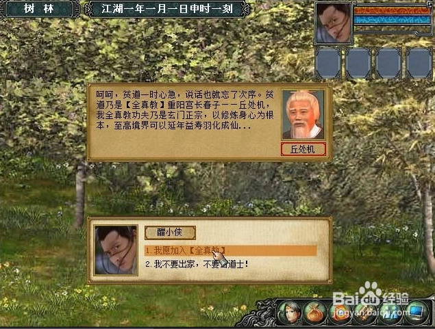 其次要进古墓先进全真教:所以游戏开始的第一天我去树林疯狂砍树到了午时,回来触发剧情,发现官兵欺负小女孩,我选择挺身而出,结果gg,被全真道士救了,让我去树林找他,为了进古墓,我先勉为其难的加入了全真教。