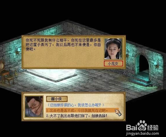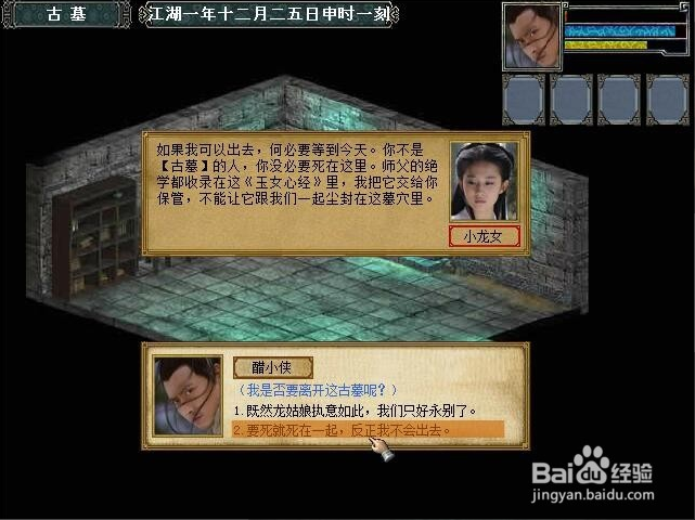 最后战败了,选择和小龙女死在一起,发现九阴真经和出古墓之法,古墓密道走法前几个方向都知道了,不知道最后一个,最一个是随机的,如果失败了就读档。
