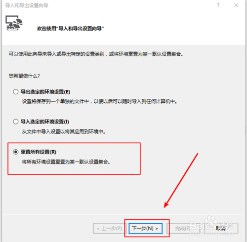 在“导入和导出设置”中选择”重置所有设置“,点击”下一步“。