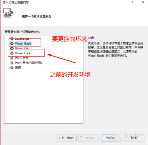 接下来选择要切换到的集成开发环境,比如我之前是vc++,现在要使用vb开发环境。直接选择visual basic,然后点击完成即可。