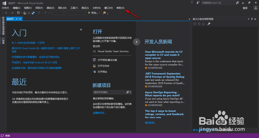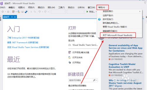 退出导入导出设置向导后,点击“帮助”——“关于Microsoft Visual studio"。