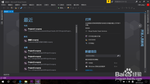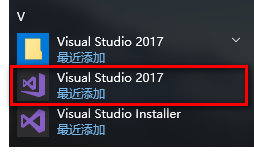 关闭并重启软件,点击左下角的开始菜单栏,在开始菜单栏中找到并打开“VisualStudio 2017”用鼠标按住“Visual Studio2017”图标拖动到桌面即可创建快捷方式