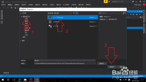 选择 Visual C++ 中的 C++文件(.cpp) --> "添加"