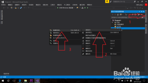 在屏幕左侧会出现 “解决方案资源管理器”,如果没有,可以在 “视图”栏中找到。 然后在“源文件”右击 --> "添加“--> ”新建项“