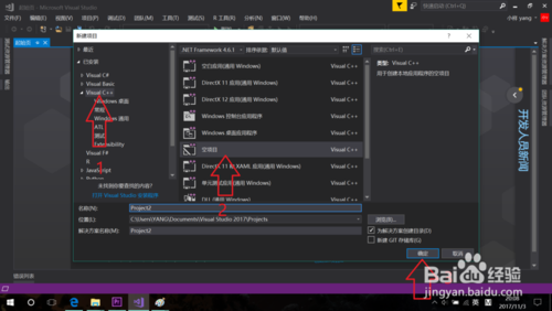 新建一个 C语言的空项目项目: “Visual C++”-->“空项目” --> 然后可以给项目命名,和确定所要存放的位置,点击“确定”