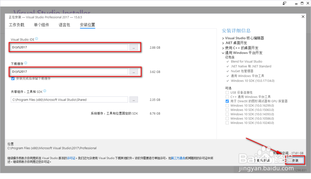 勾选自己需要的应用,默认安装在C盘,建议安装到其他磁盘,点击更改