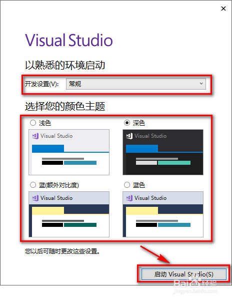 选择常规,选择自己喜欢的主题颜色,点击“启动Visual Studio”