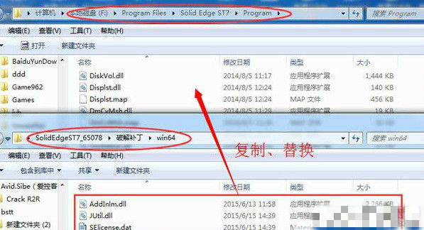 3、安装完成后,将“SolidEdgeST7_65078破解补丁win64”内的所有文件复制粘贴至程序目录覆盖原文件,默认安装目录为C:Program FilesSolid Edge ST7。(这里我是安装在F盘符中)