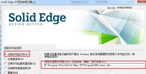 4、通过桌面快捷方式运行会弹出首次使用授权,选择已有许可文件,再点击“浏览”,找到安装目录中的“Program”目录,选择SElicense.dat载入,最后点击“确定”。