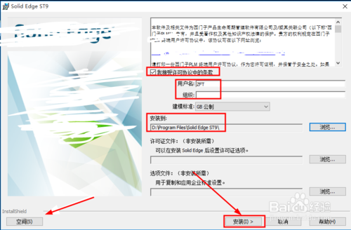 如图所示是安装向导界面 勾选同意许可协议然后输入信息后选择安装位置 建议点击左下角的空间按钮查看容量哦 最后点击安装按钮进行安装