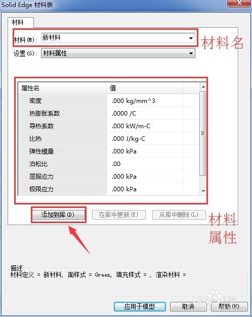 在材料表中输入新材料名称,同时在材料属性栏中输入相应的数据,最后点击“添加到库”即可;