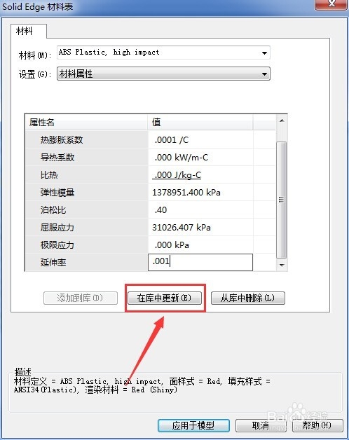 如果发现某项材料的属性数据不准确,可以对它进行更新,在材料下拉菜单中选中目标材料后,修改属性栏中相应的数据,最后单击“从库中更新”,材料的数据就更新完毕了。