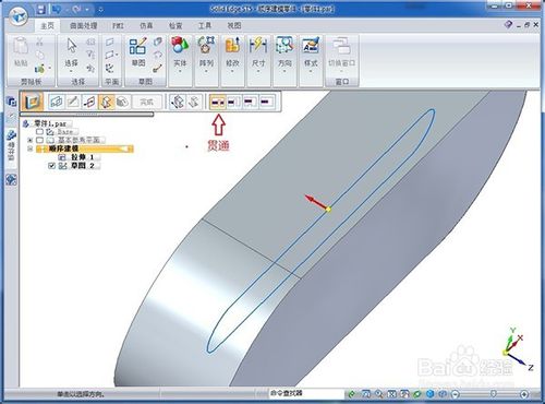 点击“贯通”后,移动鼠标,可以发现从草图平面开始出现一个红色箭头,箭头所指的方向就是我们要除料的方向,如果把鼠标放在草图平面上,则单向箭头变成双向箭头,意味着能把草图平面两边的材料都去除掉,如下图所示: