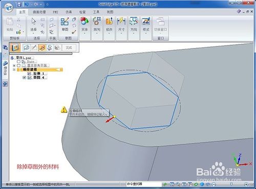 如果去除的材料轮廓的草图绘制步骤比留下的材料轮廓的草图步骤多,则我们可以做留下的材料轮廓的草图,然后去除掉草图外的材料即可。如下图所示(仅做举例用,不代表最佳建模操作),要去除六边形外的区域:
