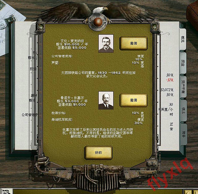 开局选经理,一个好的经理开局可以给你省下好几百K的资金啊,开局经理鲁道夫?狄塞尔,这家伙牛,柴油机车购买便宜30%啊,而且工资那个低啊,并且开局很容易选到,是一个极佳的开局经理。选不到可以多来几次S/L。