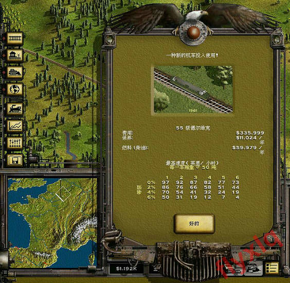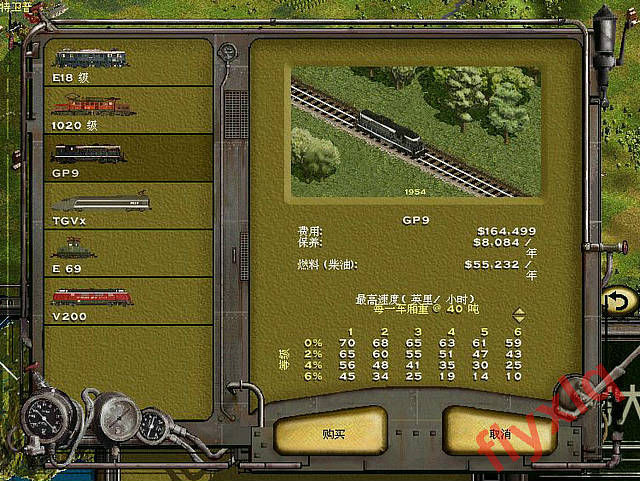 铁路造好了,该买车了,造的是普通单轨,所以只能买柴油车咯,开局这个美国产的GP9挺不错的,保养很低,燃料相对柴油车来说,也相当低了,加速度和可靠性都十分不错(参见表格),重载爬坡能力也很牛X,不错,要了。下面那个德国产的红色V200其实也还好,便宜而且速度不错,不过缺点很明显,可靠性太差了。开局如果一定要选V200的话一定要加守车,降低故障率。看见没,柴油车的价格都比平时便宜,多亏了刚选的经理。