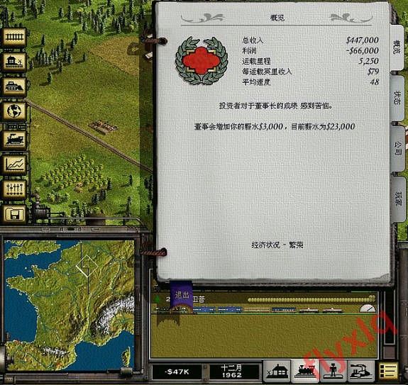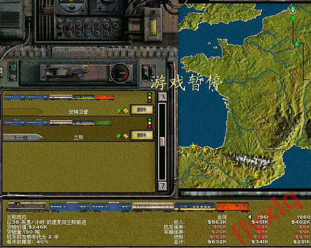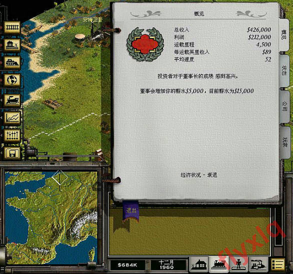 哈哈,第一趟车缓缓驶出车站,车上带了253K的货物。这个图每个房子年产4乘客2邮件,所以一般的客运火车编组是2乘客1邮件,等装满一半再出发。客运火车特别是后期的高速客运火车最理想的是挂两节车厢,不过如果只装满一节的话就会亏本,毕竟人脑不可能每次都精确控制,所以比较可行的是挂3节车厢等装满一半后再出发,这样即使装了两节也不亏本。不过买的这个GP9是客货两用车,不能浪费了载重能力,加挂一节餐车,增收20%的乘客收入。注意开局只能开一列火车,如果开了两列,兰斯的需求很快就会降低,后续发展就没有后劲了。