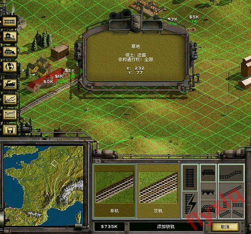 第二年继续贷款修路,横向修到坐标232再纵向修,刚才在转弯处还有个农场挡住去路了,为了让铁路更直,把农场给直接铲掉了,花了100多K啊。