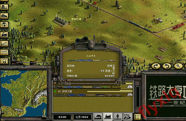 终于借到钱开通安特卫普到第戎了,车头用的是55级德尔缔克,牵引力很牛,所以加挂两车货物,对速度影响不大,多捞点外块。第戎站刚建,需求还是很低的,所以从第戎开出到需求高的安特卫普,等回来的时候第戎的需求就起来了。