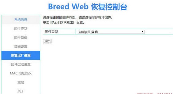 4、恢复固件之前最好在Breed Web恢复控制台恢复一下出厂设置,固件类型:Config区(公版),如下图。