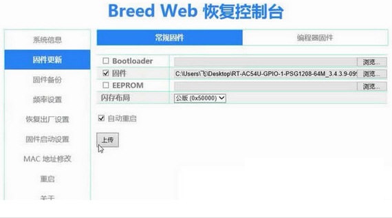 5、恢复固件方法:固件更新->选中右侧固件->浏览找到固件点击上传即可。