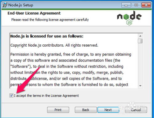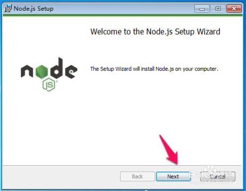 点击软件安装包然后进入nodejs的安装向导界面,直接点击next,如下图: