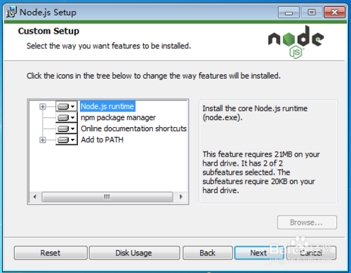 下图中国是选择安装nodejs的组件的,这里小编还是默认,就是全部安装,然后可以看到四个大组件的最后一个组件是Add to Path,这个就是将新安装的nodejs添加到环境变量,如下图: