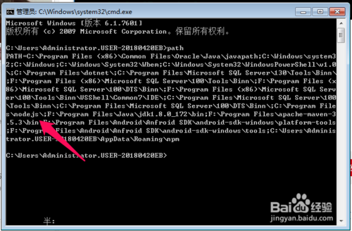 这个时候我们打开cmd命令窗口输入【path】,看一下是否已经将nodejs添加到了环境变量中,下图中显示已经将nodejs添加到了系统的环境变量中,如下图: