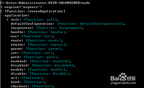 接下来试一下刚才安装的express,首先在cmd命令窗口中输入node进入到编辑模式,然后输入【require('express')】,如果配置成功的话就会看到cmd命令窗口中有输出,如果配置失败的话检查一下配置的环境变量,如下图: