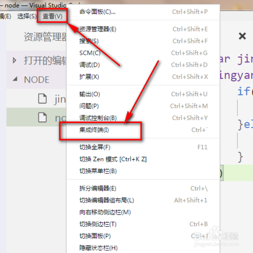 然后在vscode里面打开终端,打开方法如图所示,“查看”——“集成终端”。