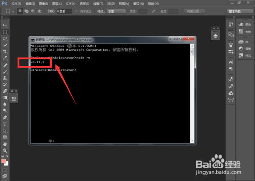 这里会显示Node.js的版本,如果显示的Node.js版本与第一步中查看的版本一致的话,就说明Node.js安装正常,说明如图: