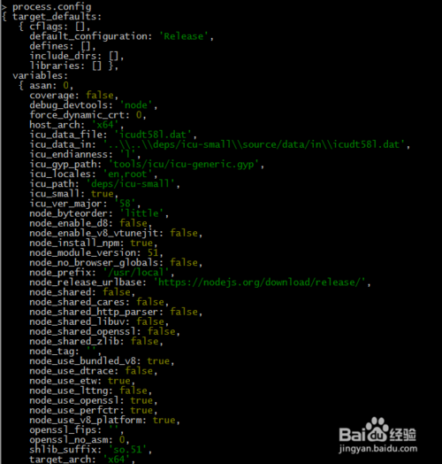 第二步,如果要查看node.js中的属性和一些参数,可以使用process.config命令,如下图所示: