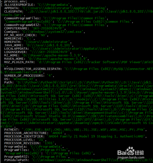 第四步,如果要查看操作系统中安装软件和配置软件参数,可以使用process.env,如下图所示: