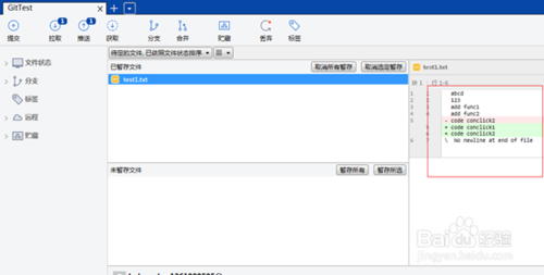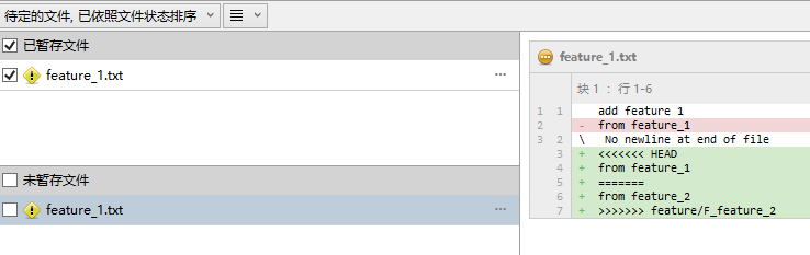 点击close,查看未提交的更改,提示feature_1.txt出现冲突