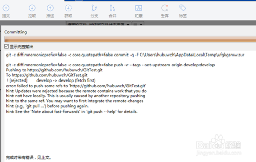 推送代码。这个时候你修改完了本地的功能,并不知道远程仓库上也有人提交了该文件的修改。直接推送本地修改,推送本地工作副本到远程仓库,运行完成后会报错,大概是提示本地仓库和远程仓库版本不一致,无法提交,但是本地工作副本的修改却是已经提交到了本地仓库。如下图。
