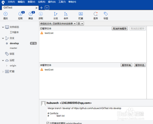 预览中,表明feature分支将合并到develop,点击确定,进行提交合并,合并成功后