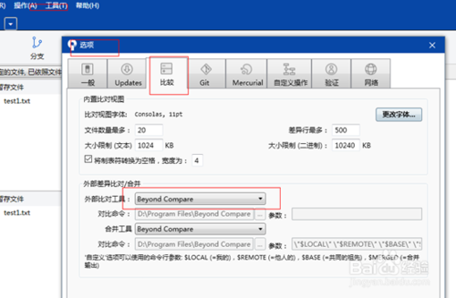 冲突的解决需要一个外部代码对比工具,我这里使用的是Beyond Compare 4,大家可以自己百度下载安装,然后集成到sourceTree软件中。如下图。在外部对比工具中找到Beyond Compare 4的可执行程序,点击确定。