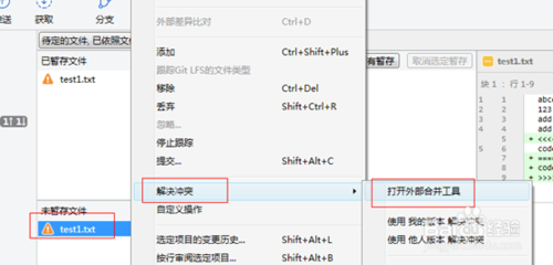 下面开始使用代码对比工具解决冲突,选中待解决冲突的代码,右键 解决冲突,打开外部合并工具。