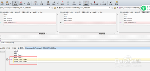 等待一会,Beyond Compare 4就会被打开。第一块是本地修改的版本,第二块是冲突两者(本地仓库和远程仓库)相同的版本基准,第三块是 远程仓库的修改。第四块是冲突处理后的代码。