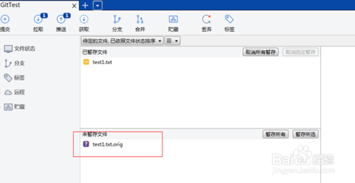 切到sourceTree界面,可以看到多了一个解决冲突的中间文件,由于冲突已解决,直接右键移除,