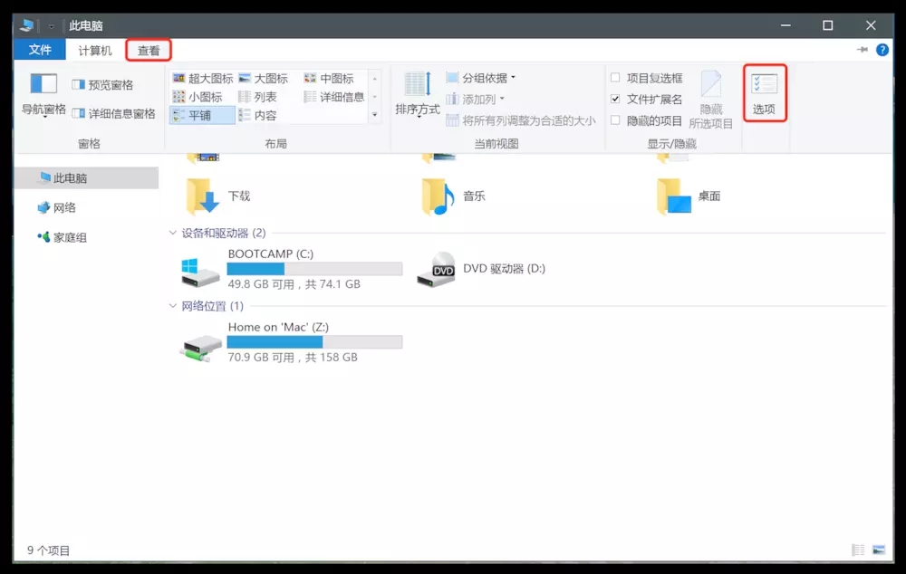 打开 我的电脑 ,点击 查看 菜单中的 选项 。