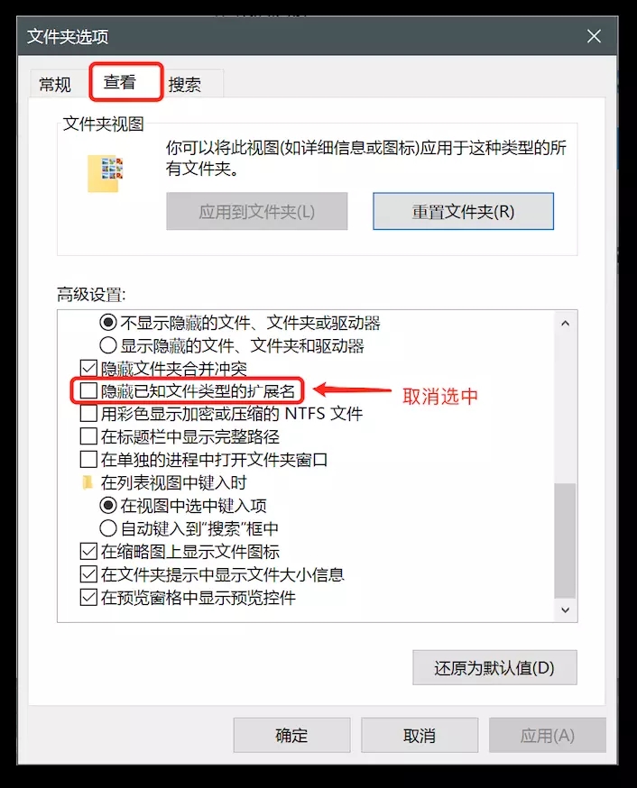弹出 文件夹选项 ,将 隐藏已知文件类型的扩展名 选项取消选中后点击 确定 即可。