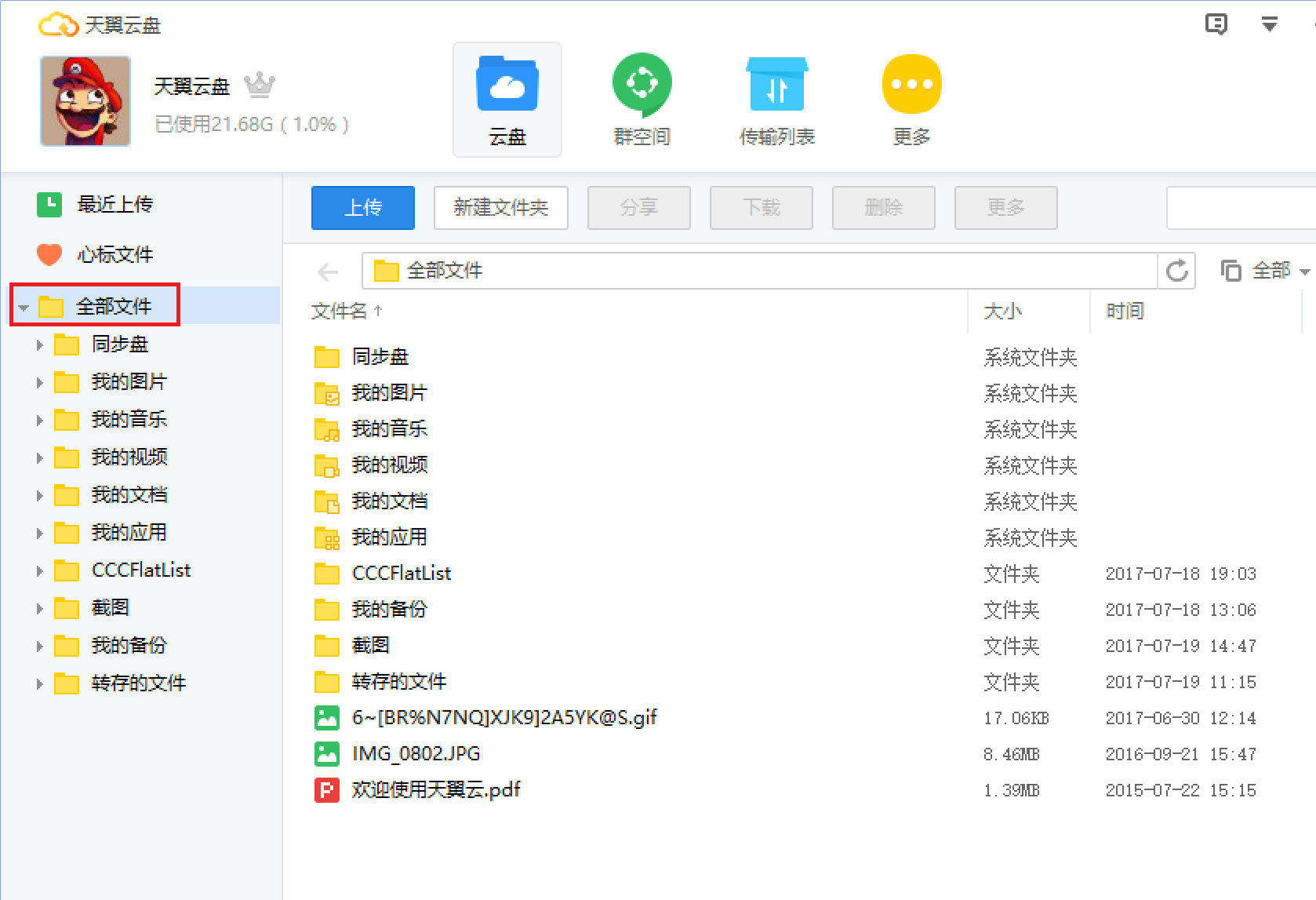 (1)登录PC客户端后点击界面中的“全部文件”按钮,进入文件管理界面(或直接打开某个文件夹);