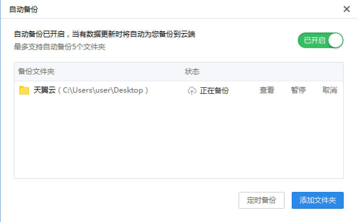 目前,仅PC客户端支持自动备份文件夹功能。安装PC客户端后,在本地指定文件夹为自动备份文件夹,通过在自动备份文件夹进行文件新建、复制、粘贴、修改操作,客户端会将变更文件自动备份至云端。但是,在自动备份文件夹进行文件删除操作是不会同步到云端哦,即使对文件进行误删除操作,云端也能找回!非常适合备份办公文件!