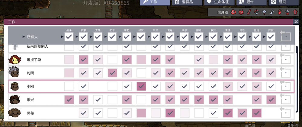 7. 我还没能成功在后期(20+人)控制住压力值。我的解决方案是:让他们崩溃去吧。招人的时候注意他们的崩溃反应,有的人是呕吐,有的人是破坏。只选呕吐的。然后多造几个空气净化器。只要能呼吸有食物那么别的都不是事儿。