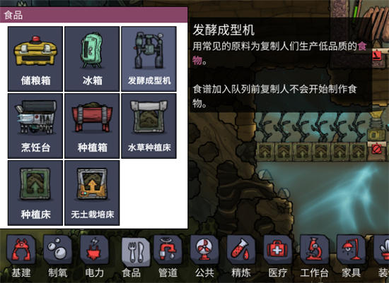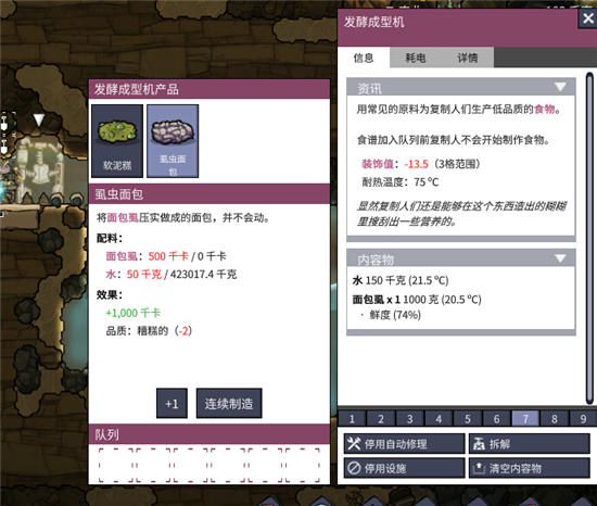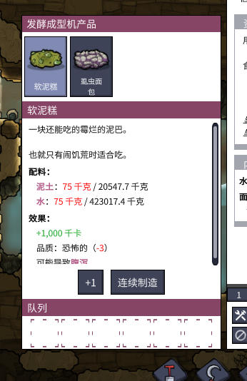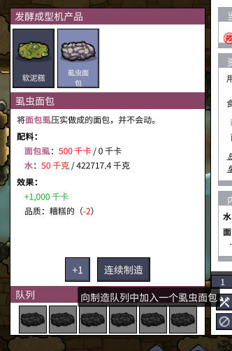 可以看到发酵成型机一共有两种食品可以加工,一种是加工泥土和水制成的软泥糕(也就是所谓的吃土),另一种是加工水和面包虱制成的虱虫面包,这里我们先讲虱虫面包。