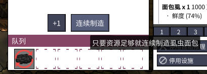 造好指定数量后小人停止制造自动去进行别的工作,必须重新指定制造数量小人才会再来制造。如果制作食物的材料不足会像上图这样在队列里呈现黑色图标(即无法制作),有足够的材料时则会显示为彩色。【连续制造】选择后则会出现一个循环图标。
