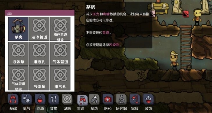 1、在游戏左下角的菜单,从左往右数第6个菜单,如果你打了汉化补丁,就是[管道],第一个就是厕所/茅房,这也是游戏中第一个没有解锁条件,可以直接建造的设施了。