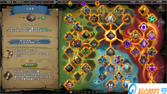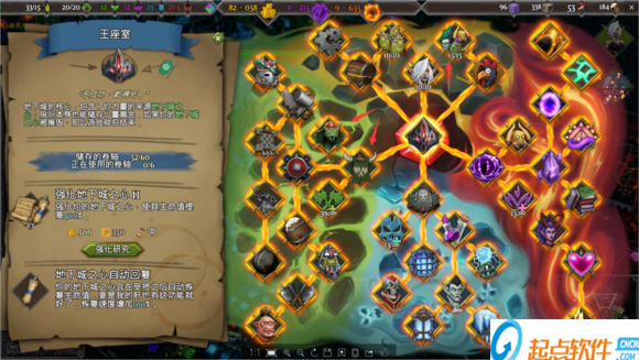 最上面两个是:矿工创造和怪物创造;第二排是财宝室,英雄泰瑞亚和孵化室;左下方是加入部落势力的休息室,攻击力加成和加入治疗型娜迦兵种。娜迦兵种需要用邪恶值解锁,请及时去打掉地图左上右边的人类据点。