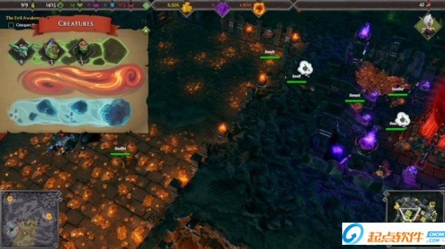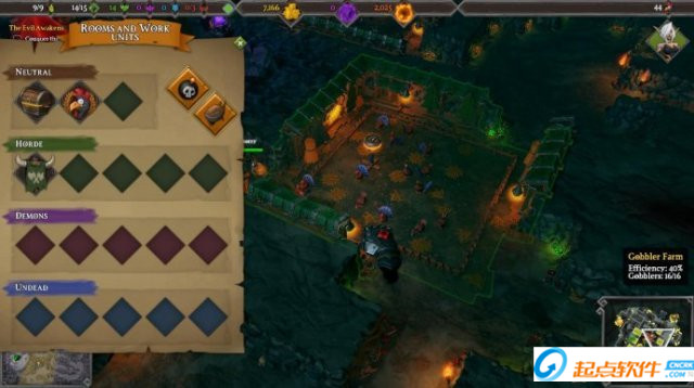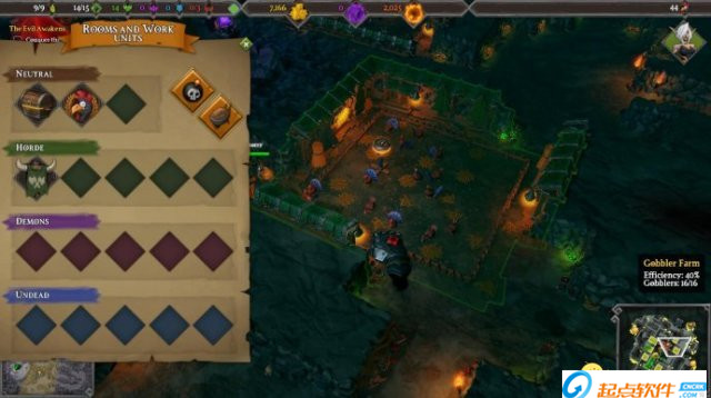 我在玩的时候犯了一个错误,就是还以为像《地下城守护者2》那样,需要在地图上挖掘到召唤入口,于是满地图挖了一个多小时还没挖到,我这就觉得不对劲了。于是打开了V键(大概是研究相关的汇总),原来是有分支,你需要用金钱和邪恶值(就是界面顶上橙色的那个球)来研究新的房间、功能和技能。金钱直接采矿,邪恶值就需要你在初次组队后到地上去占据人类据点,本关有两个邪恶能量池可以为你生产能量。至于初次组队的怪兽从哪里来也困扰了我好久,后来才发现,V键科技树里,当你研究了“怪物创造”这个科技点后,在界面左边拉出菜单中就能找到你可以创建的怪物,哥布林和蛮兵(从外型上好像是这样的怪兽,反正就是《地下城守护者2》里的初级兵种)。